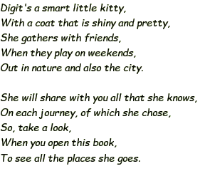 | Ardyce changes gears and displays her artistic talents with her wonderful children's book series, A Kitty Named Digit, delightful "tails" about the adventures of a big little kitty with twenty-seven toes. Under the nom de plume of "Zadie Cahill," Ardyce writes sweet and funny limericks to accompany her beautiful illustrations. |